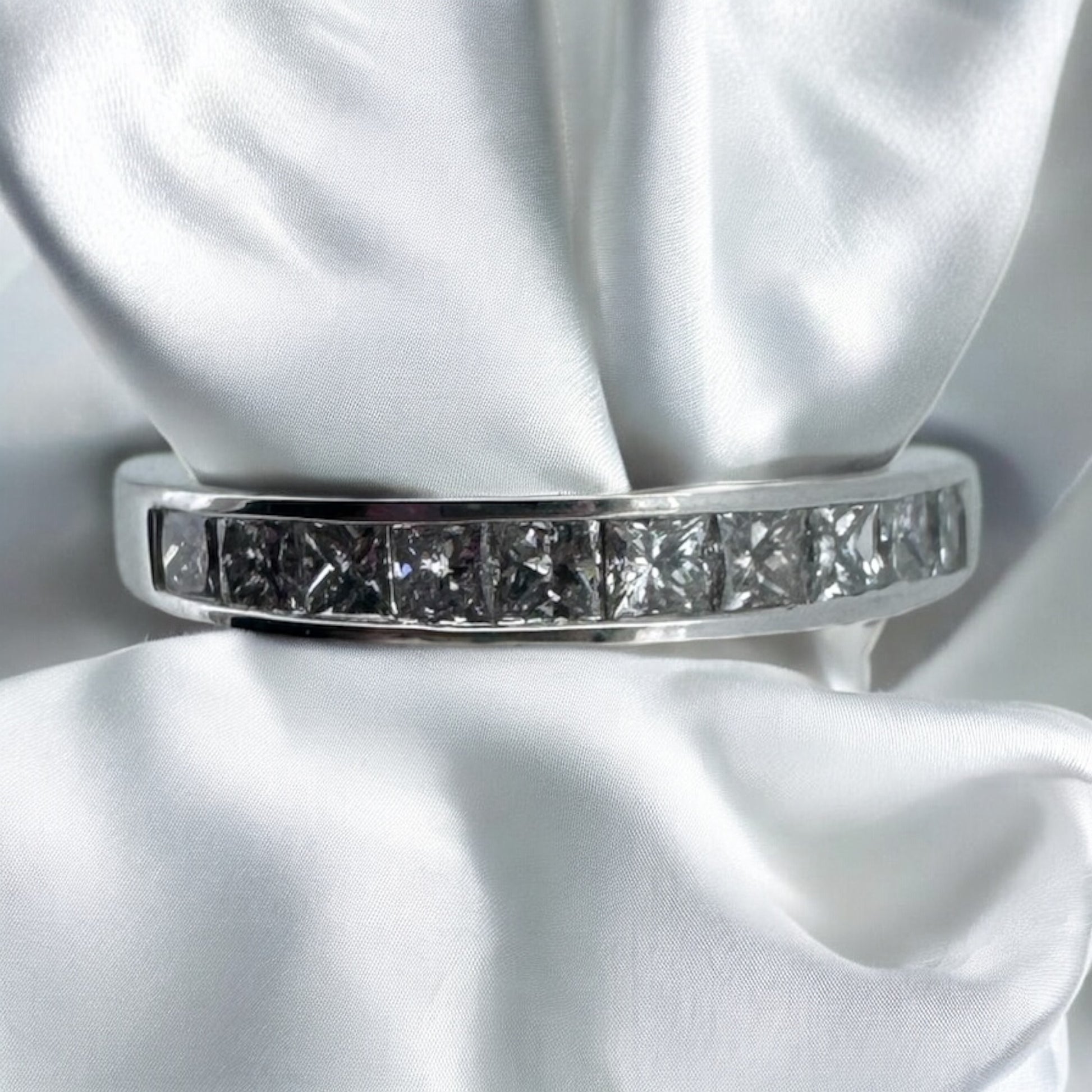 This elegant 3/4 carat total weight princess-cut channel band in 14K white gold features ten sparkling stones set securely for lasting beauty. Its sleek design offers a comfortable fit, making it perfect for daily wear or special occasions. A timeless piece that complements any jewelry collection with understated sophistication.