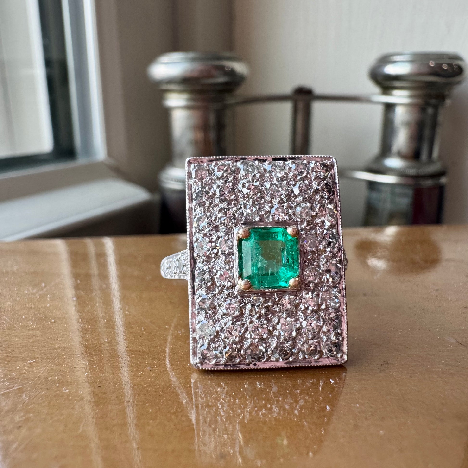 Step into the glamour of the Art Deco era with this striking platinum ring. At its center glows a vivid 0.75-carat cushion cut emerald, framed by a dazzling field of 1.25 carats of round European cut diamonds. The bold geometric design and intricate detailing capture the sophistication of the 1920s, while the vibrant emerald adds a touch of timeless color. A rare and elegant piece, perfect for collectors or anyone seeking a statement ring with authentic vintage character.