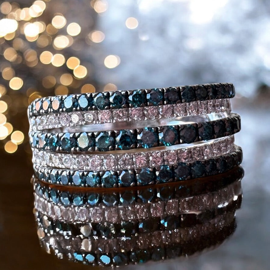 This exquisite 14-karat white gold ring features a stunning collection of round, H color, I1 clarity diamonds and blue diamonds totaling 1.00 carat weight. Its elegant design marries sophistication with timeless beauty, making it a perfect accessory for refined tastes and special occasions. The subtle blue hues of the diamonds add a unique charm, enhancing the ring’s luxurious appeal.
