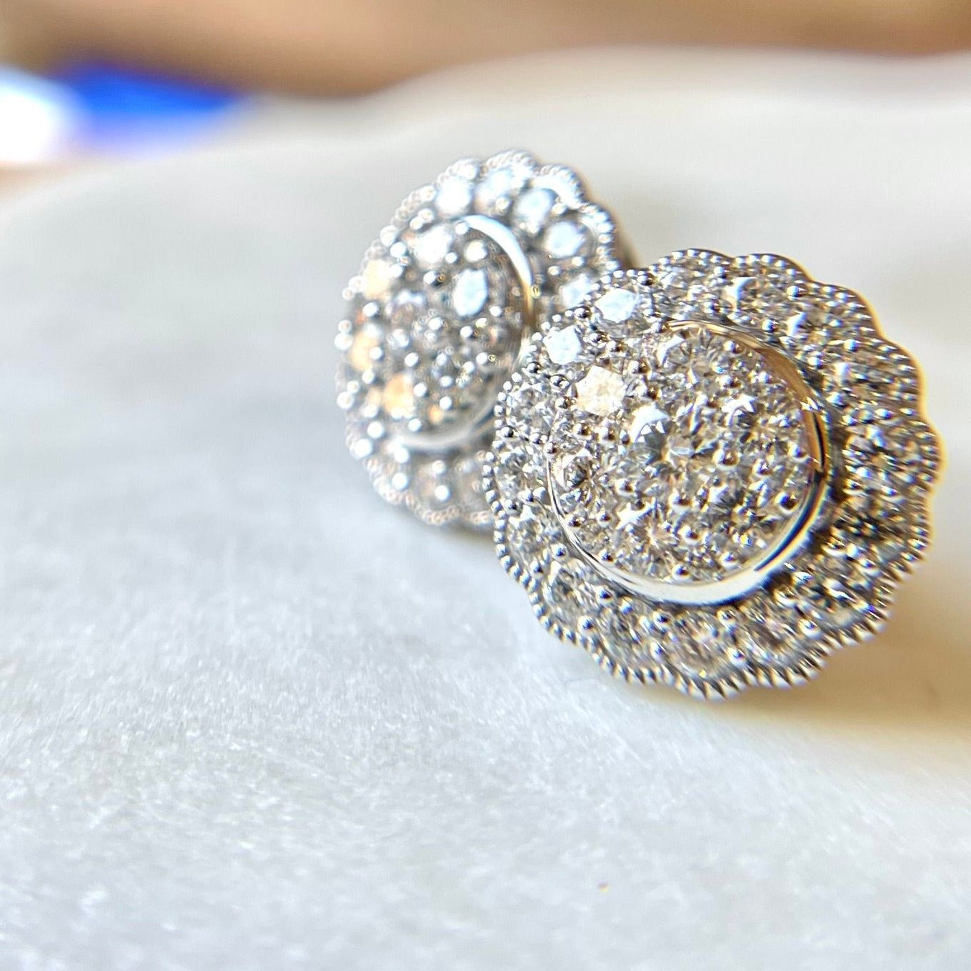 These Diamond Cluster Stud Earrings in 14K white gold offer a brilliant 1.5 carat total weight of sparkling diamonds. Their classic design enhances any outfit with timeless elegance, while the secure setting ensures comfortable, everyday wear. Perfect for adding a touch of sophistication to your jewelry collection.
