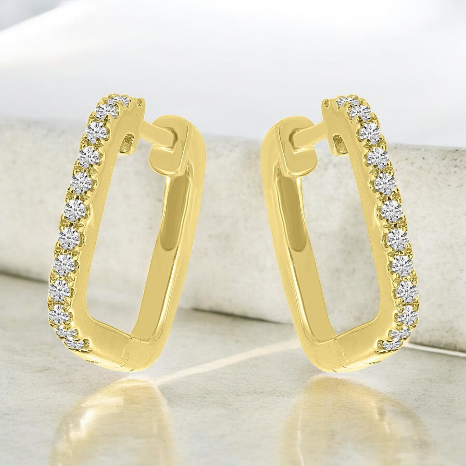 Elevate your style with these stunning 14K yellow gold huggie hoops, featuring 0.16 carats of dazzling diamonds. Their sleek design hugs your ears perfectly, adding a touch of brilliance that catches every eye. Whether for daily elegance or special moments, these earrings are a must-have accessory that effortlessly enhances any outfit. Don’t miss the chance to own beauty that shines with every wear.