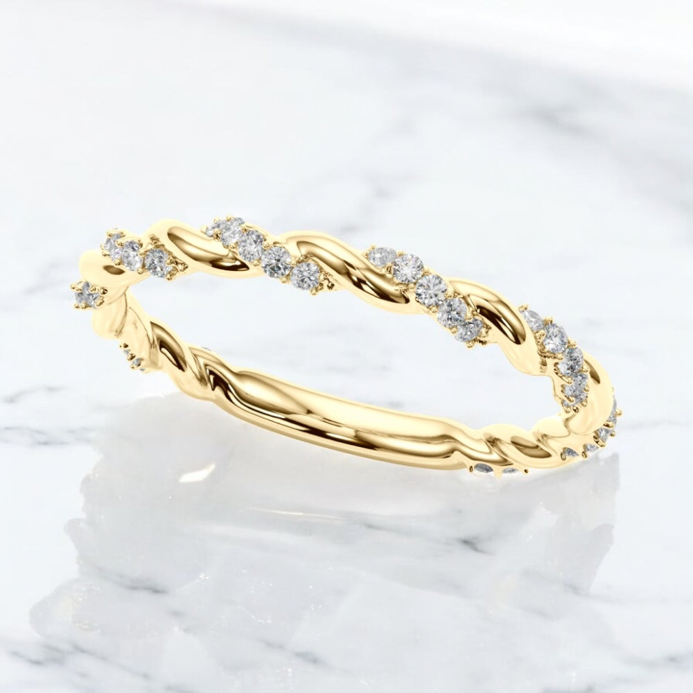 This 14K yellow gold Diamond Twist Band features 0.17 carats of sparkling diamonds, offering versatile elegance. Wear it alone for a subtle shine, stack it with other rings for a personalized look, or choose it as a delicate wedding band. Its timeless design complements any style with grace and charm.