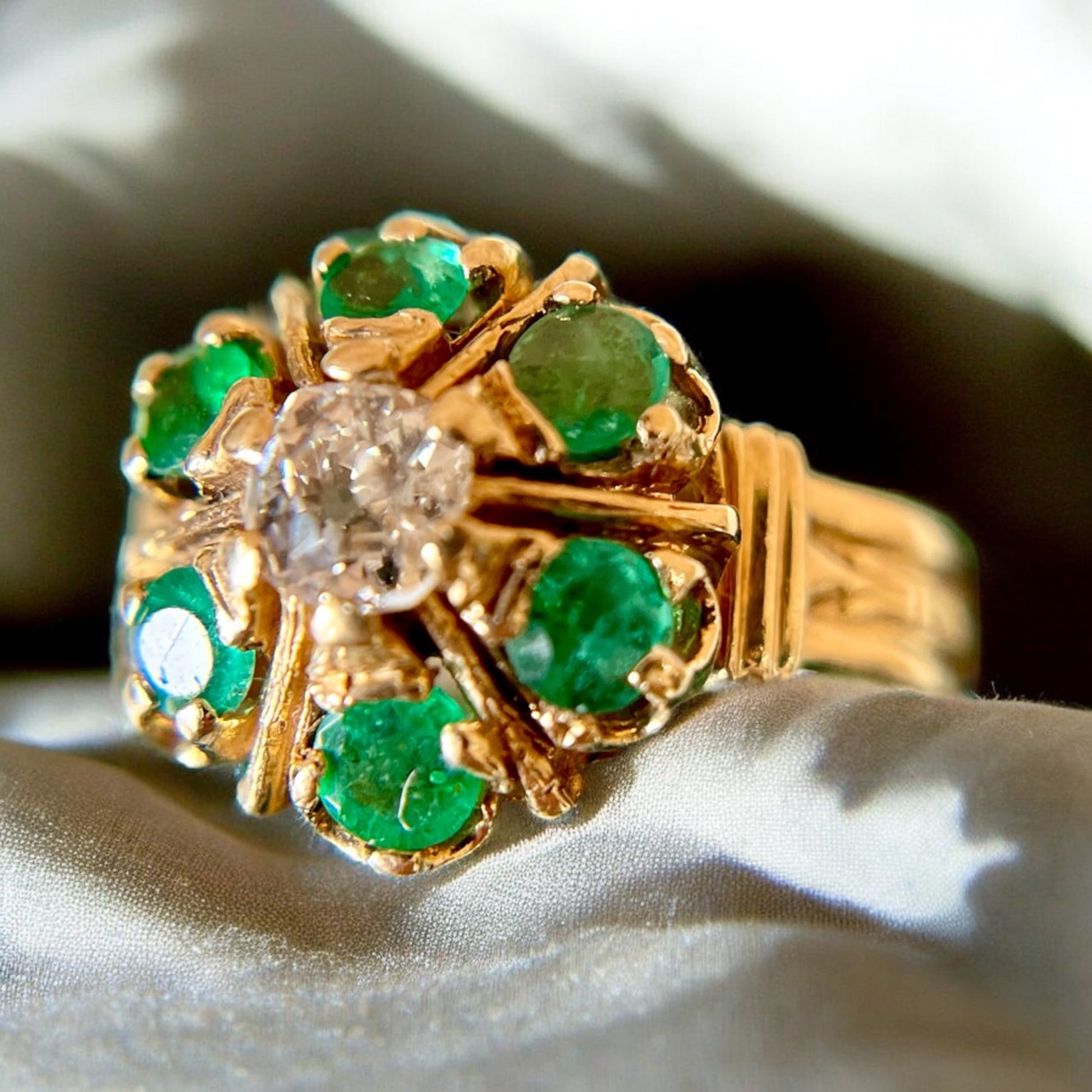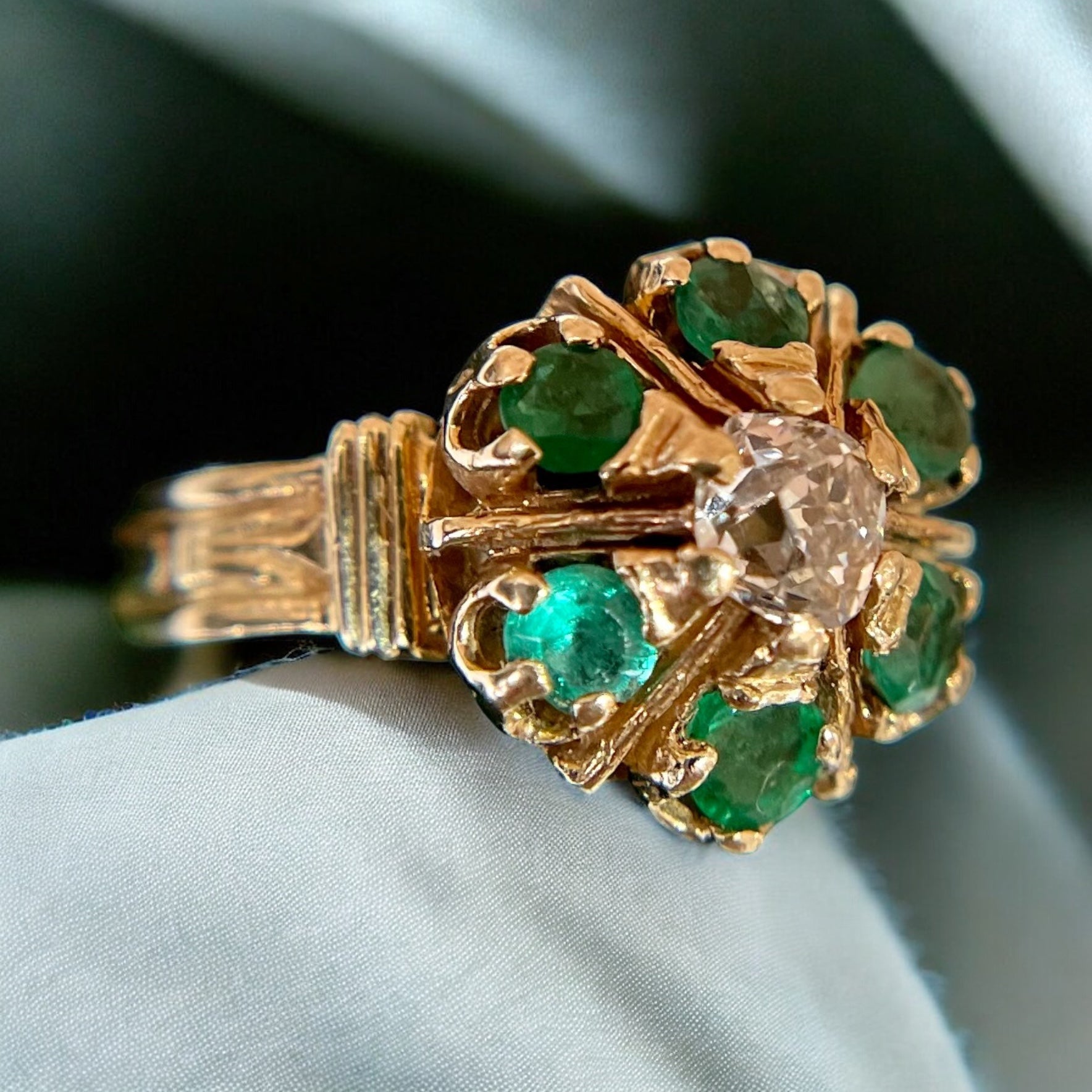 Exquisite Victorian-era elegance captured in this refined 14k gold ring. A 0.32ct Mine cut diamond takes center stage, encircled by a verdant halo of six round Emeralds totaling 0.60ctw. A sophisticated treasure that marries historical craftsmanship with timeless luxury.