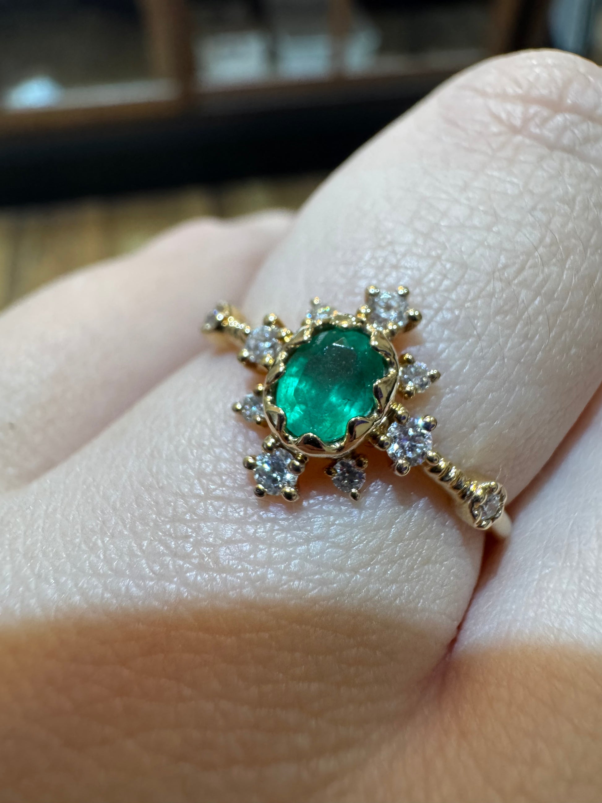 Emerald Ring with Diamond Halo - 14K Yellow Gold