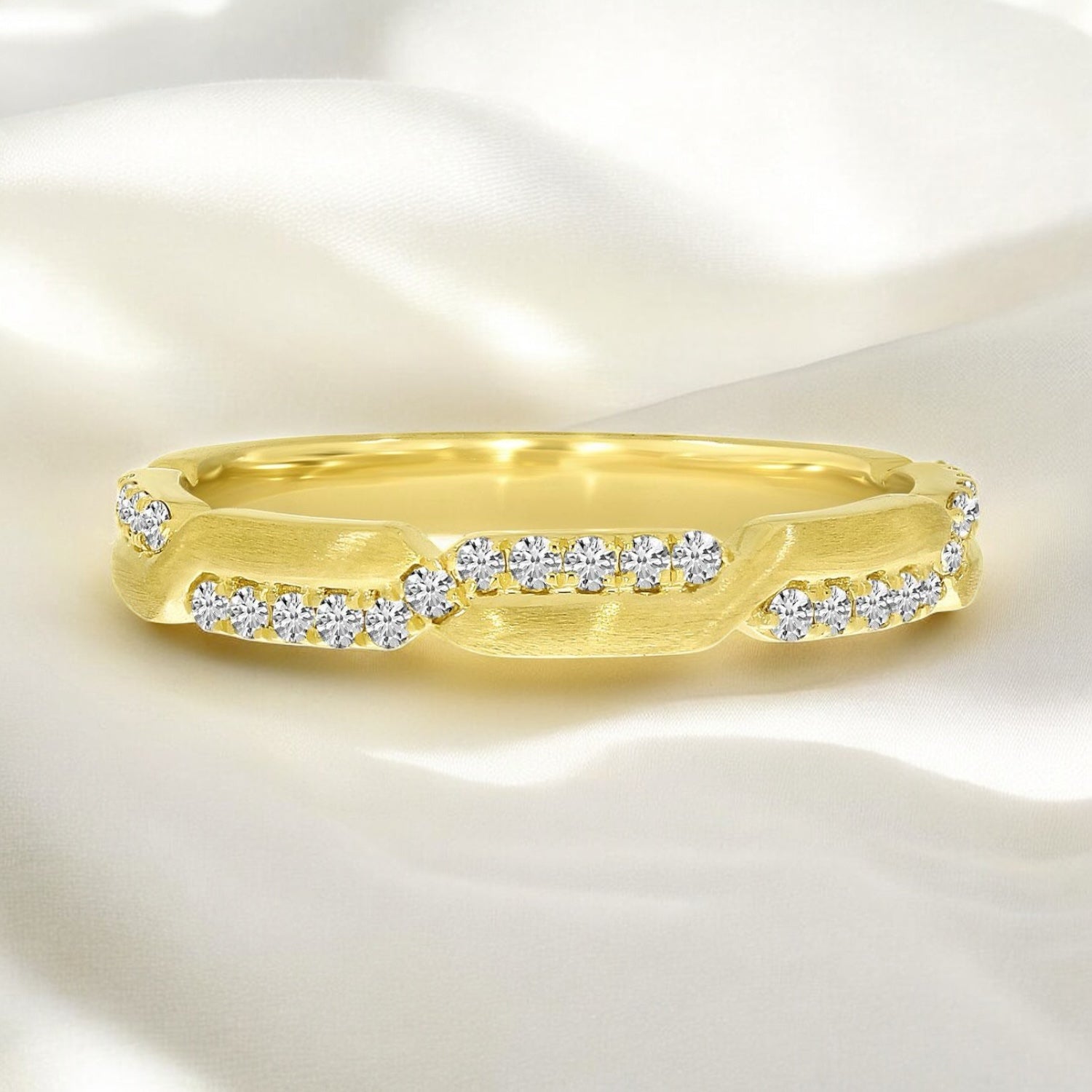 This 14K yellow gold band features a delicate 0.21 carat total weight of diamonds arranged in an elegant alternating pattern. Designed for versatility, it can be worn alone as a subtle statement, stacked with other rings for a personalized look, or paired perfectly as a wedding band. Its classic style and quality craftsmanship make it a meaningful addition to any jewelry collection.