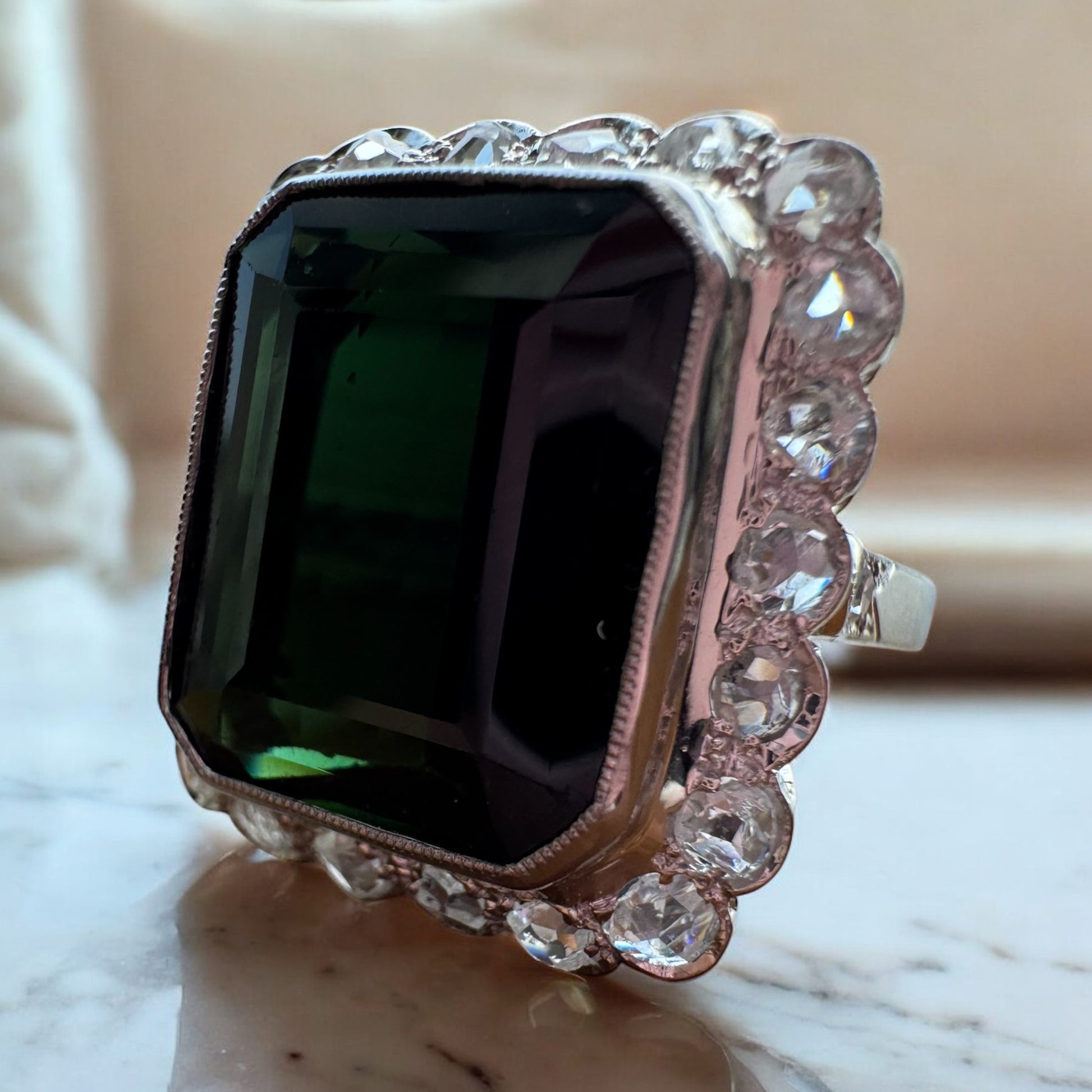 This exquisite 18K white gold Green Tourmaline Statement Ring features a stunning 10ct emerald-cut green tourmaline, surrounded by a delicate 0.90ctw rose-cut diamond halo. Early Art Deco period design, it combines timeless elegance with a bold, vibrant centerpiece. Perfect for those seeking a unique and meaningful piece, this ring offers both beauty and sophistication to elevate any collection.