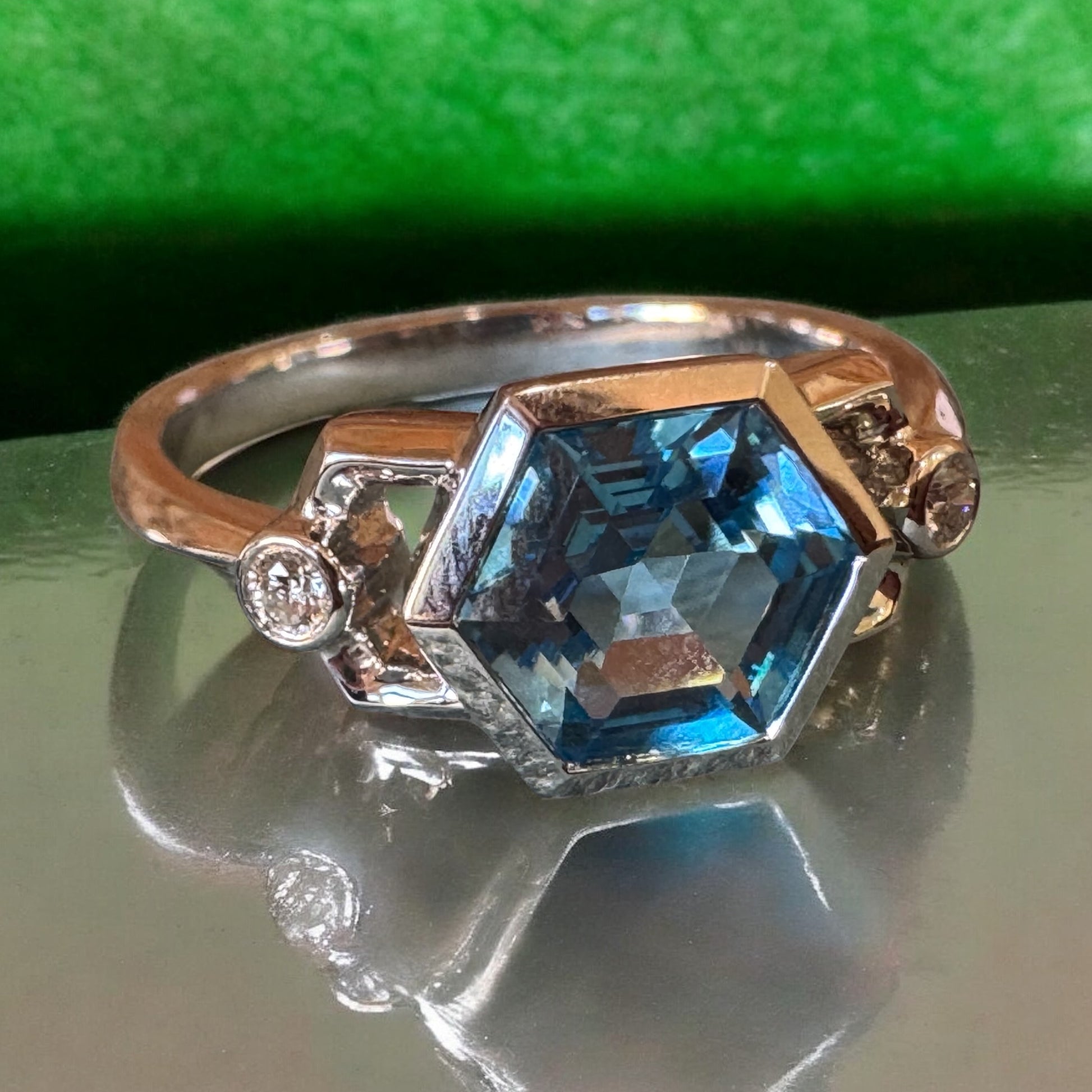 Add a splash of sparkle with this Hexagon Blue Topaz Ring! Featuring a dazzling 1.89ct blue topaz centerpiece flanked by a delicate diamond on each side (0.05ctw total), all set in gleaming 14K white gold. It’s the perfect playful pop of color and shine to brighten any outfit!