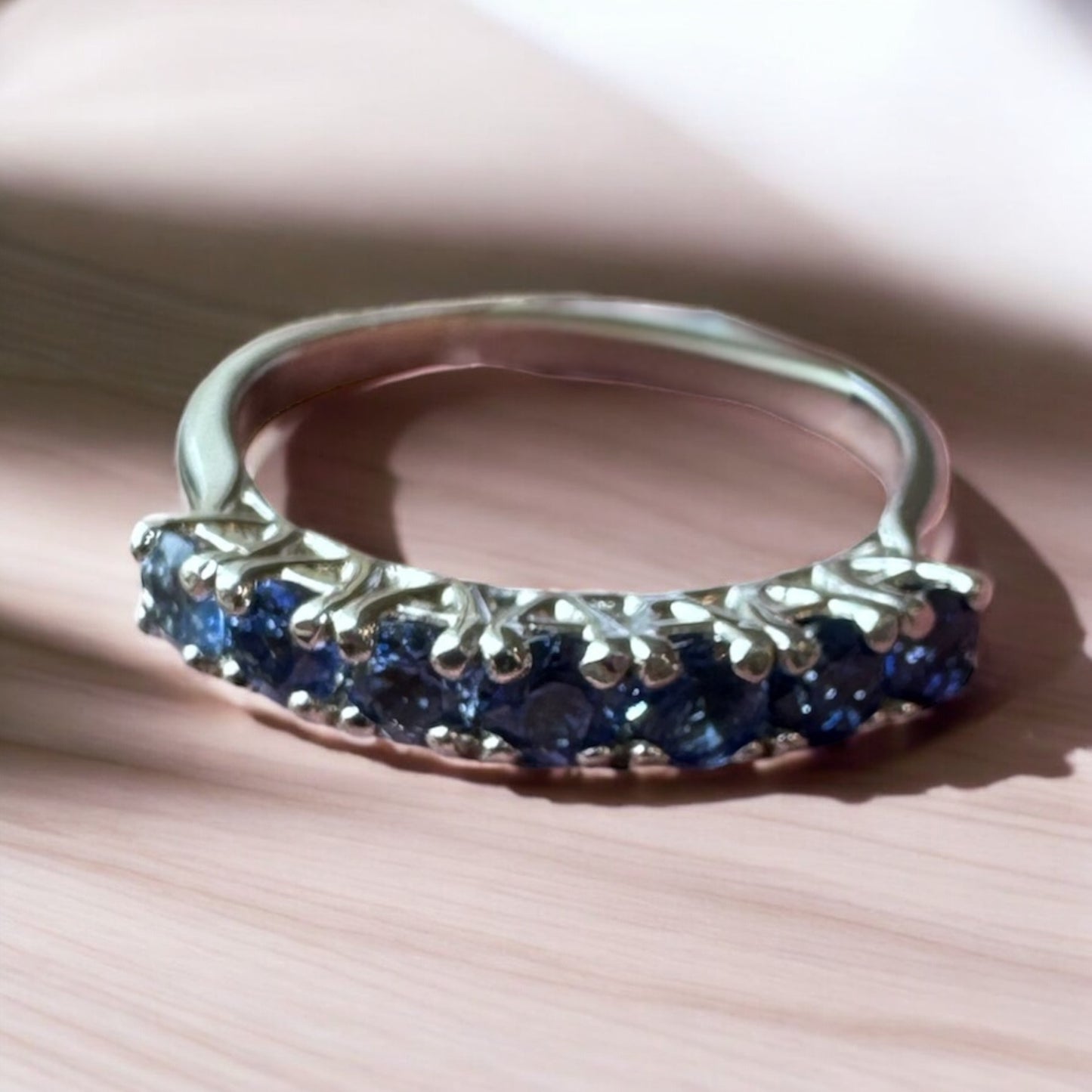 This 14K white gold band features a stunning gradient of sapphires, shifting effortlessly from deep navy to soft sky blue. Sleek and modern with a vibrant twist, the ombré design creates a seamless flow of color perfect for stacking or wearing solo as a statement.