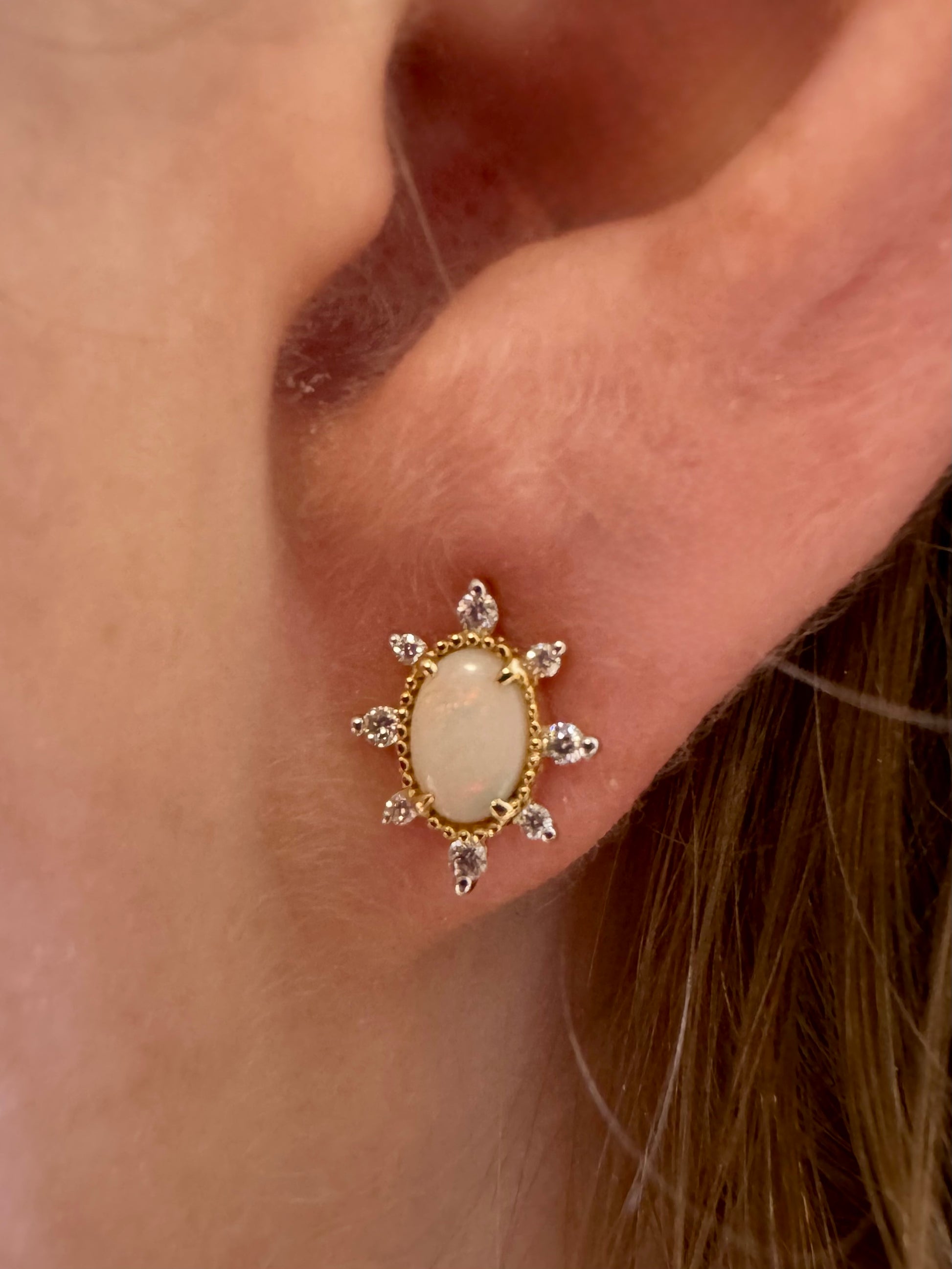 Elegant oval opals take center stage in these refined stud earrings, each framed by a delicate halo of diamonds totaling 0.14 carats. Crafted in 14K yellow gold, the warm metal complements the opal's luminous play of color while the diamond surround adds a certain sophistication. Perfect for everyday elegance or special occasions, these versatile studs offer understated luxury with striking visual impact.