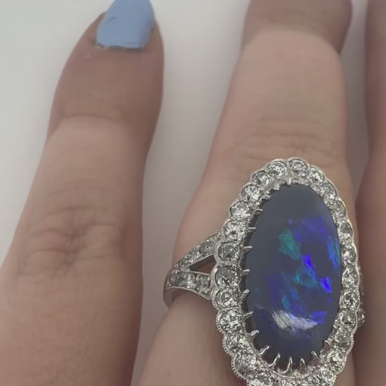 Oval Black Opal and Diamond Ring - Art Deco Era