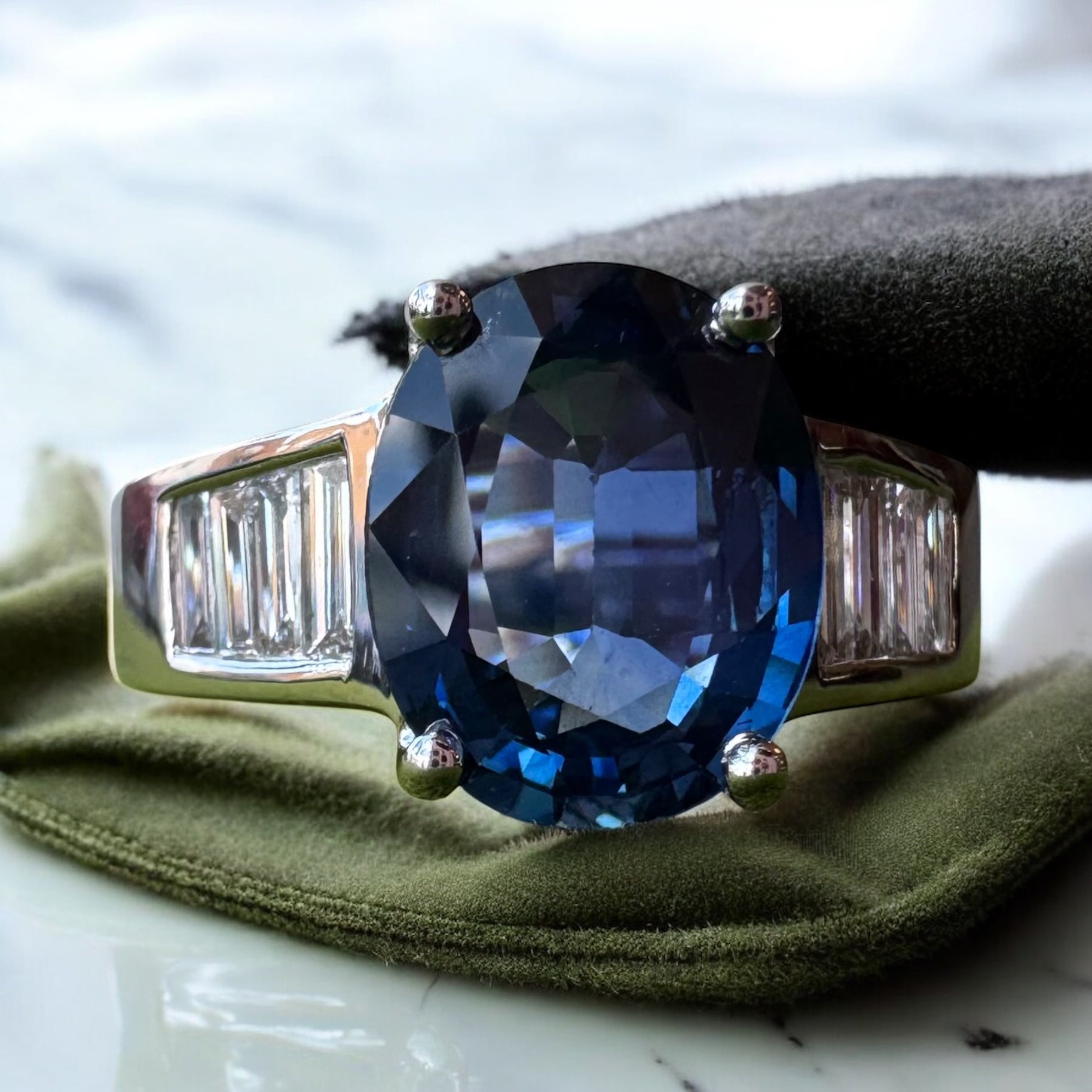 This stunning 18K white gold ring features a captivating 3-carat oval sapphire centerpiece, beautifully complemented by 0.40 carats of sparkling diamond baguette side stones. The elegant design highlights the rich blue sapphire while adding a touch of brilliance with the diamond accents, making it a perfect choice for those seeking timeless sophistication and exceptional craftsmanship.