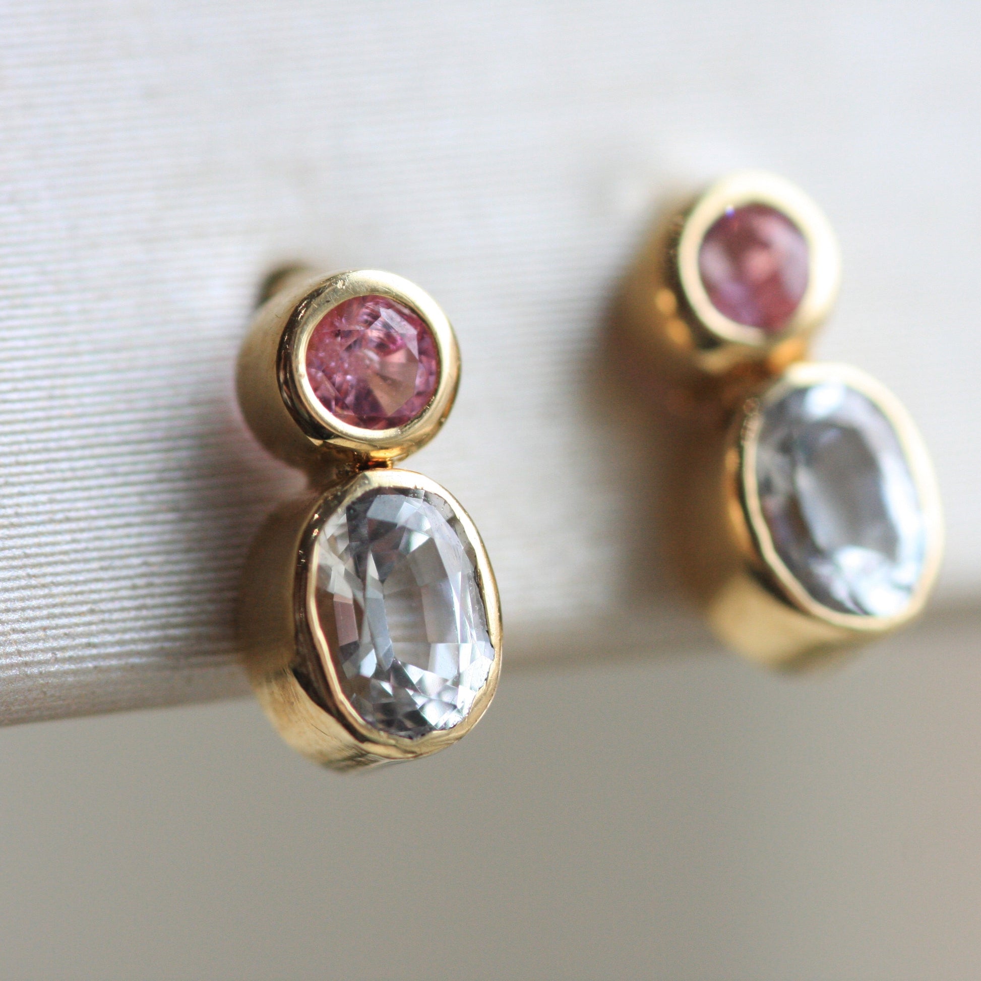 Delicate two-tier studs featuring brilliant round pink tourmalines bezel-set in 14K yellow gold above oval white sapphires. The refined stacking design makes these perfect for second piercings or layered looks. Lightweight and versatile, these gemstone earrings transition effortlessly from everyday wear to special occasions. Each stone is carefully selected for color and clarity, offering a sophisticated pop of color with timeless elegance.