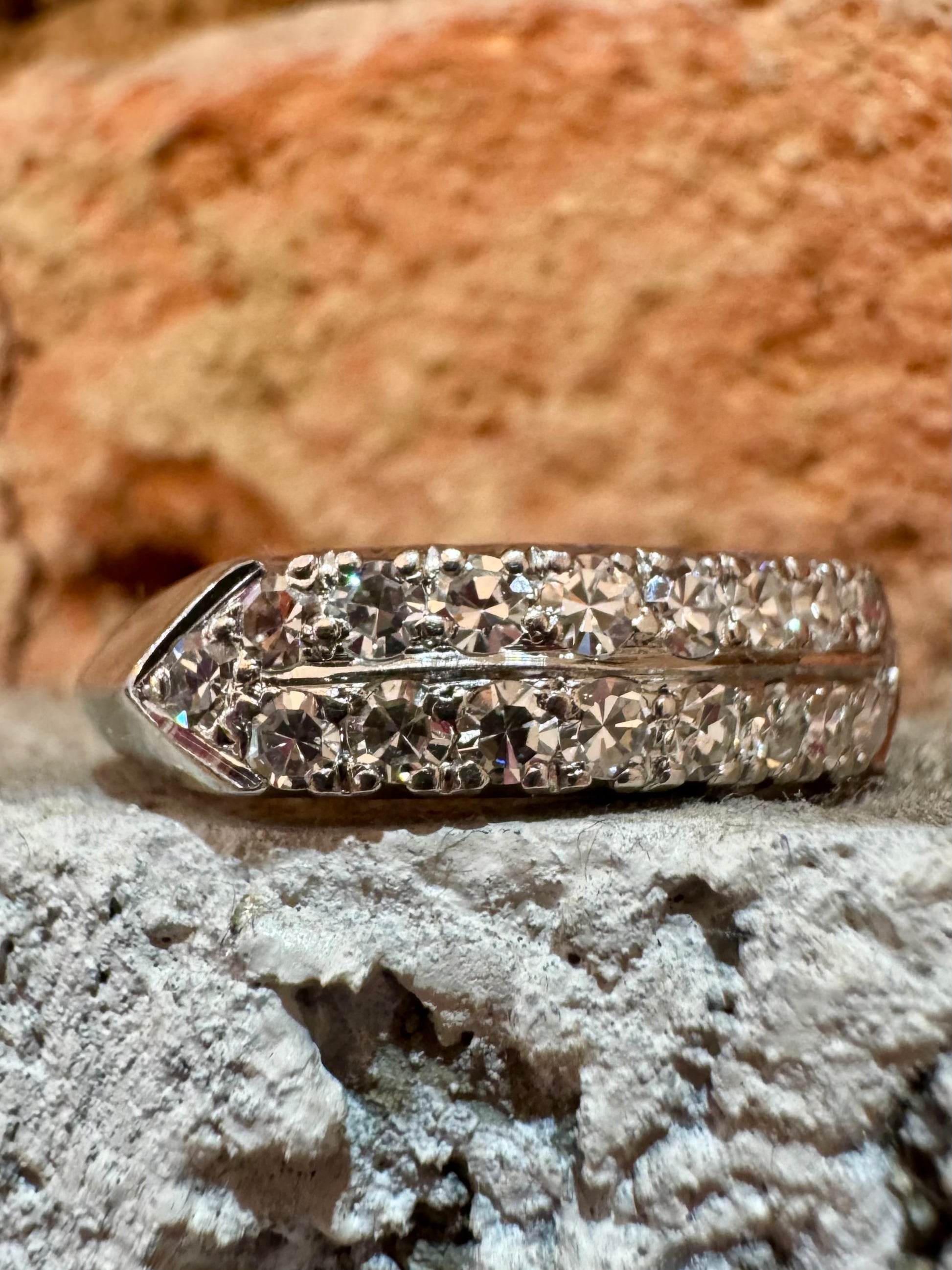 Crafted in platinum, this Art Deco band features eighteen single cut diamonds totaling 1.08 carats. The geometric precision of single cuts complements the era's architectural aesthetic, creating a timeless piece with understated elegance. Perfect as a wedding band, stackable accent, or standalone statement ring for the discerning collector.
