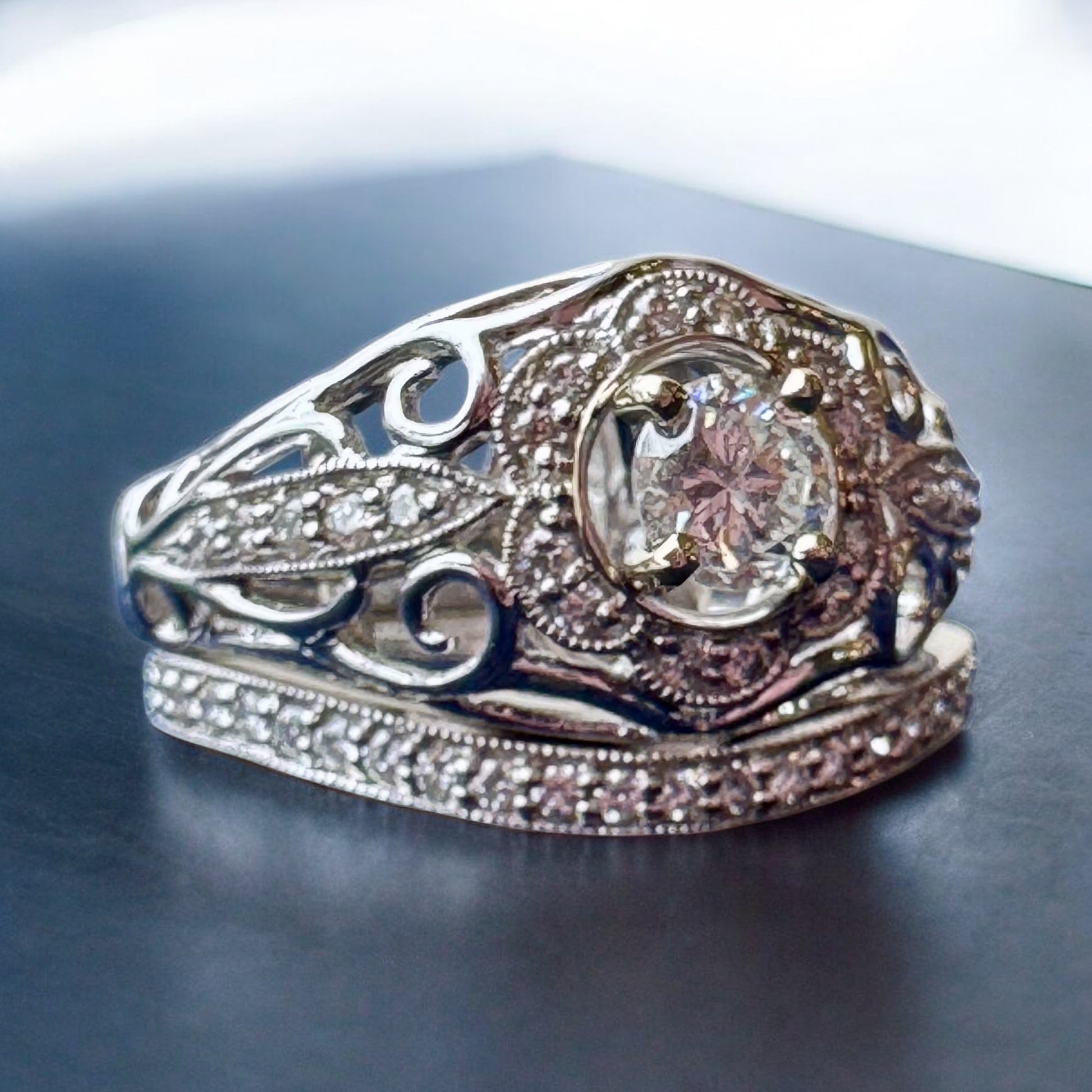 This vintage-inspired diamond wedding set in 14K white gold features a total diamond weight of 0.84 carats, combining timeless elegance with lasting quality. Designed to celebrate your special moments, the set offers a classic look that complements any style, making it a meaningful symbol of your commitment. Its durable craftsmanship ensures it will be cherished for years to come.