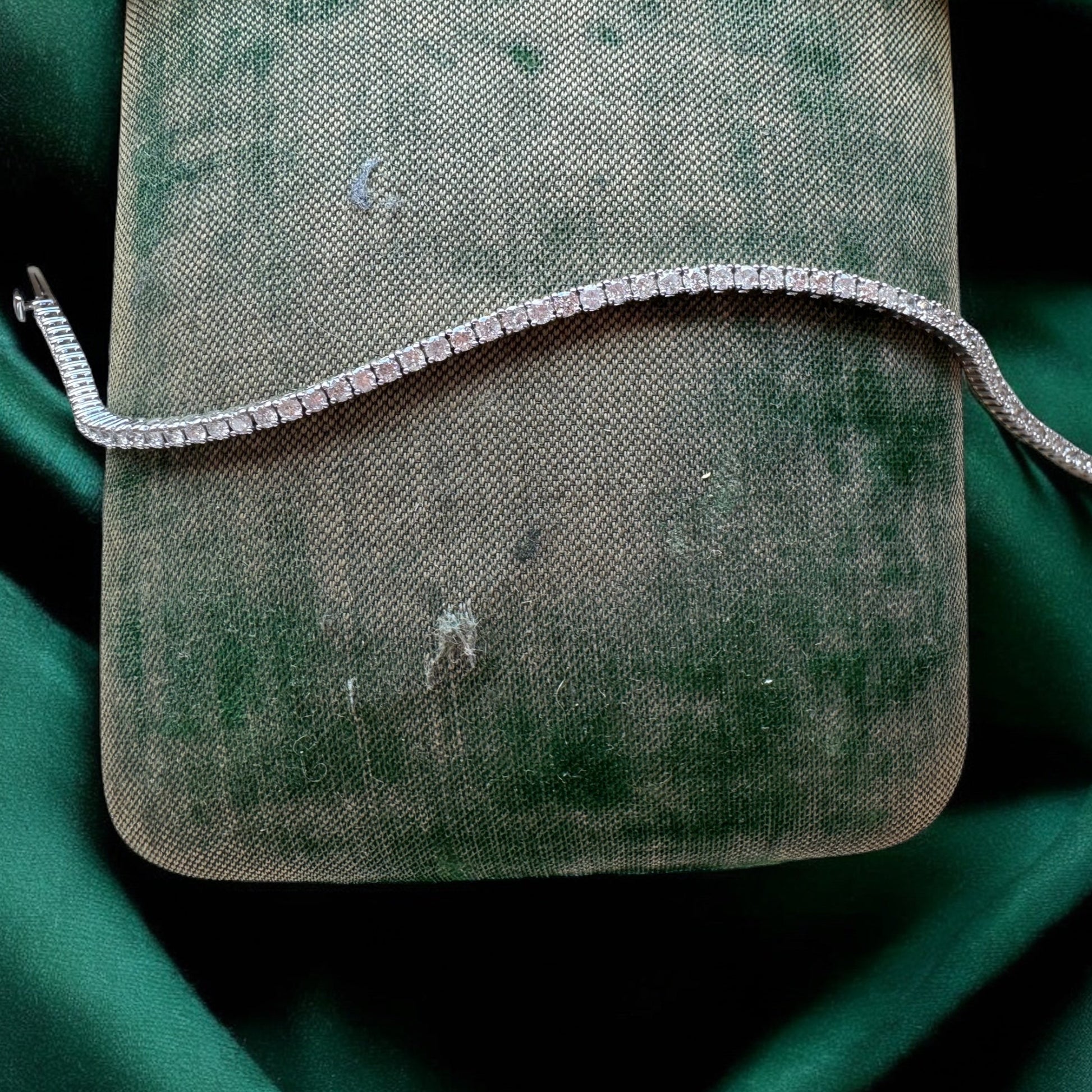Timeless and elegant, this 14K white gold tennis bracelet sparkles with 2.40 carats total weight of brilliant diamonds. Measuring 7 inches in length, it drapes gracefully around the wrist, offering the perfect balance of sophistication and everyday wearability. Each diamond is meticulously set to maximize brilliance, creating a continuous line of light that never goes out of style. Whether worn alone for understated elegance or layered for added glamour, this diamond tennis bracelet is a classic essential for every fine jewelry collection.